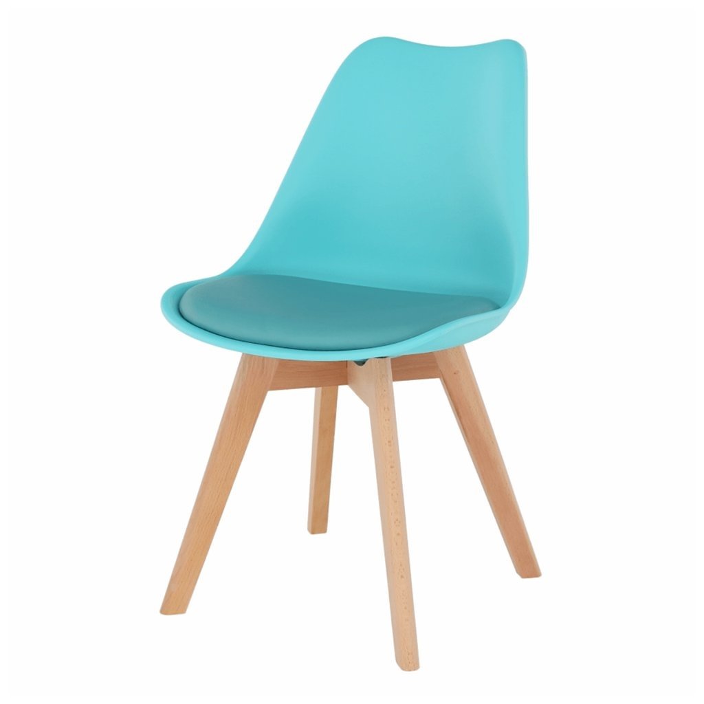 Jídelní plastová židle s čalouněným sedákem z ekokůže v mentolové barvě a dřevěnou podnoží v dekoru buk.