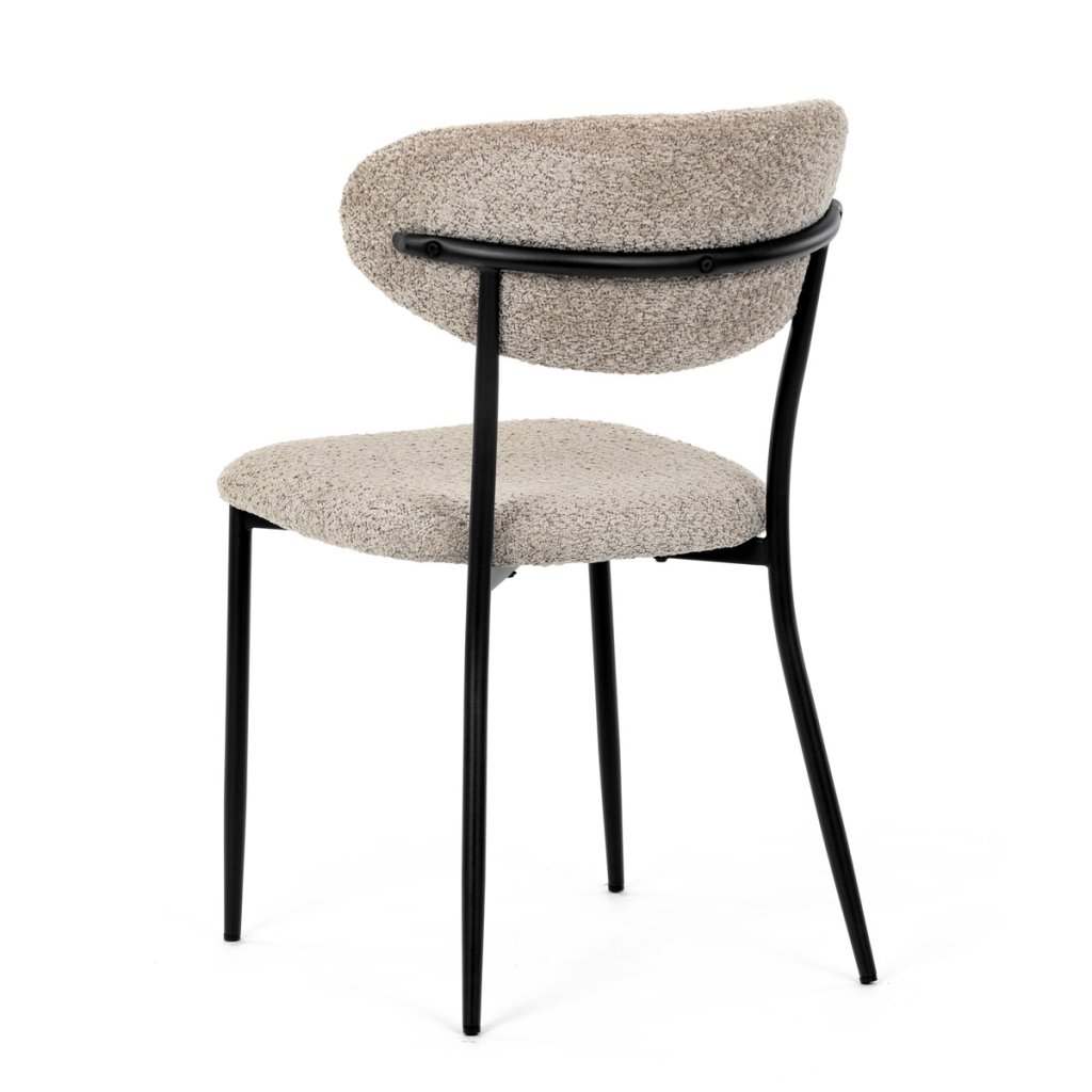 Elegantní jídelní židle značky se stane stylovým a funkčním doplňkem vaší jídelny. Čalounění z příjemné látky Bouclé dodává židli moderní a zároveň útulný vzhled, který skvěle zapadne do industriálních interiérů. Stabilní černé kovové nohy zajišťují pevnost a odolnost. Ergonomický tvar zádové opěrky a sedáku zaručuje pohodlí i při delším sezení. Minimalistický design a kvalitní zpracování dělají z této židle ideální volbu pro každodenní použití i slavnostní příležitosti.